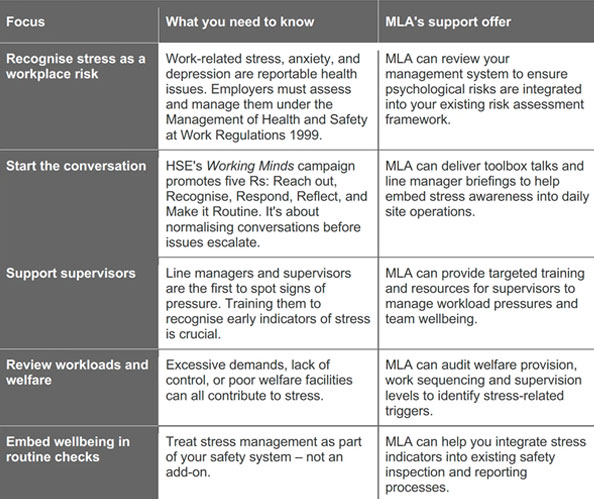 At MLA, we're reminding clients that managing stress isn't optional – it's a legal duty under the Health and Safety at Work Act and the Management Regulations. This update outlines what we're seeing on sites, what the law expects, and how MLA can help clients strengthen their occupational health management.